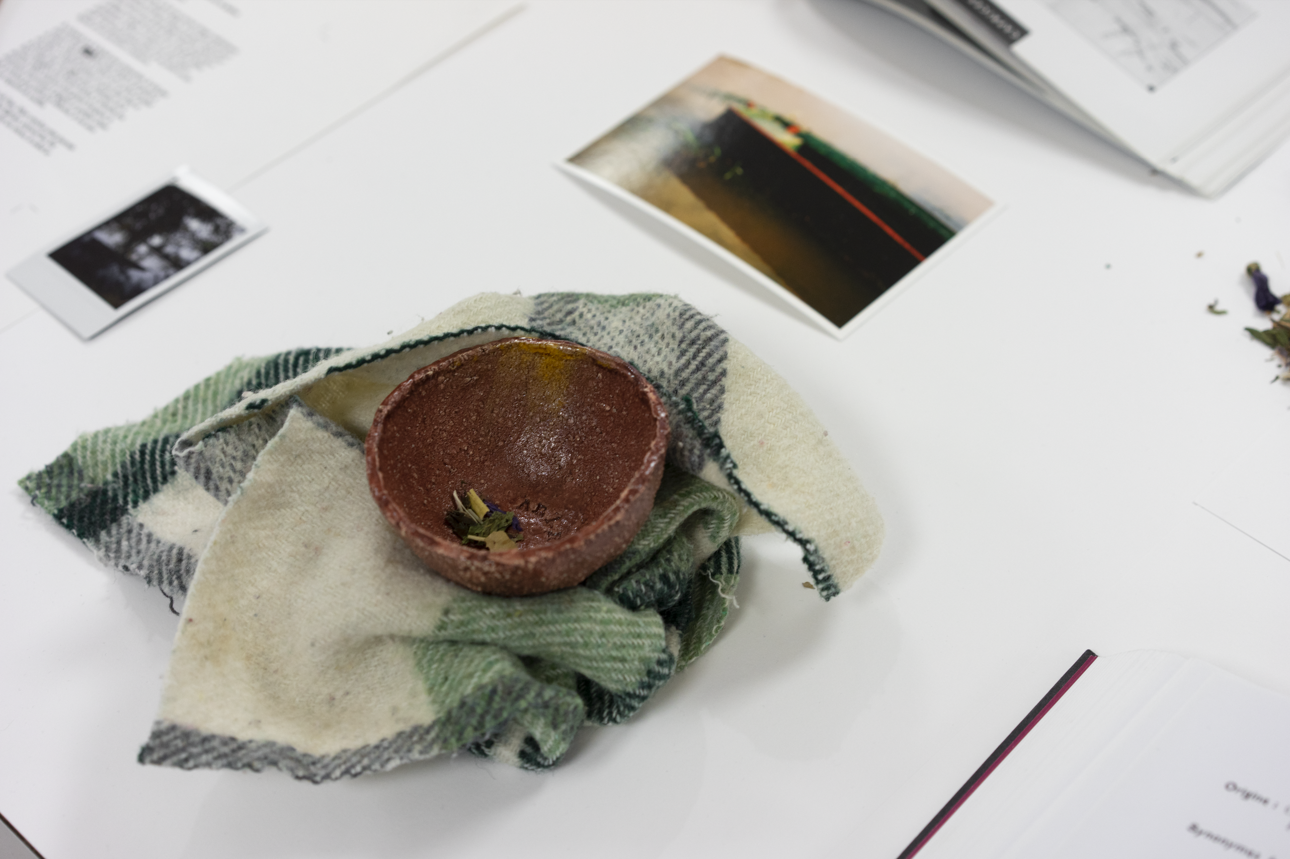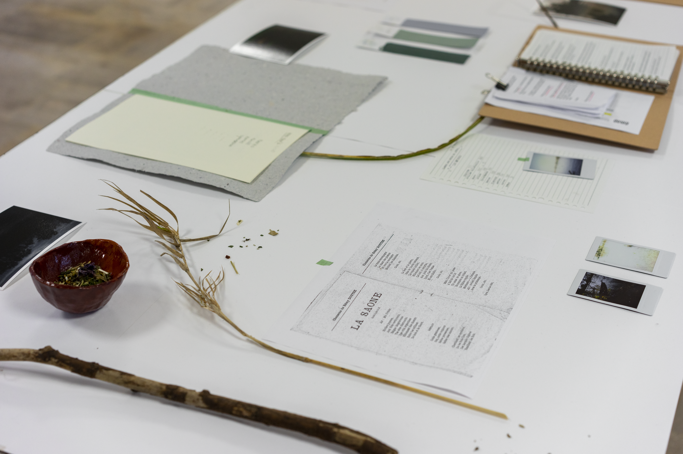 Pour accueillir la tisane, il fallait un contenant. Je me suis inspiré d’objets liés à l’art de la table, tels qu’on pourrait en retrouver dans le lit de la Saône. J’ai ainsi confectionné quinze bols en céramique, avec l’aide de Pauline Pichon, plasticienne et potière.